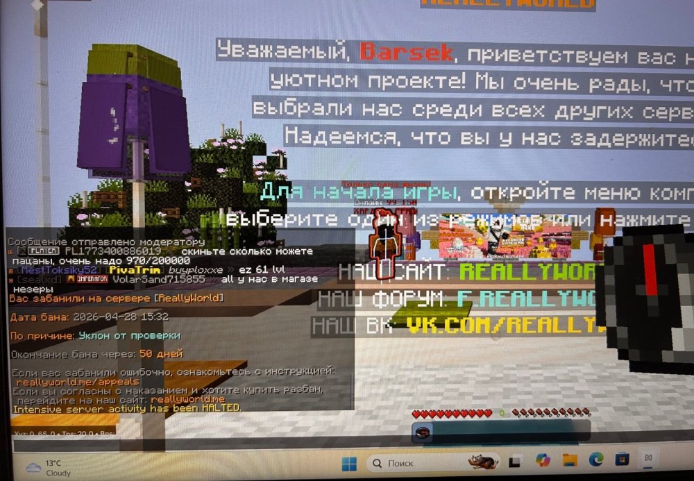 3. 1. Ваш ник: StrahRwxdxddd 2. Дата блокировки: 2026-04-28 15:32 3. На каком гриферском режиме было нарушение: Java, гриф 59 (версия Java) 4. Доказательства о нарушении: Читов у меня нет и не использовал. Я готов пройти проверку в любое время.