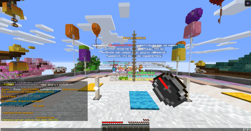 1. Ваш ник: Drafenok1303 Ник нарушителя(представителя форума):Ник не указан Суть нарушения/ошибки администратора:Забанил просто так Когда это произошло/происходит:я просто зашел на серв и сразу проверка потом бан Что должен был сделать?(Администрация форума):Хотя бы выслушать меня по поводу моей проблемы с анидеском а не игнорить а позже забанить Доказательства о нарушении (фото/видео):Предоставил Дополнительный комментарий, ссылка на жалобу (если есть):Я просто зашел на сервер и меня вызвали на проверку по анидеск так как у меня в регионе не работает анидеск я написал в чат что могу пройти по дс или по любой другой программе а он просто игнорил даже слова в чат не написал а потом забанил. Я мог и могу пройти проверку по дискорду как я говорил раннее. Прошу снять с меня блокировку. Также на скрине видно что у меня не ванильное положение рук жто потомучто я использую визуалы также могу это доказать