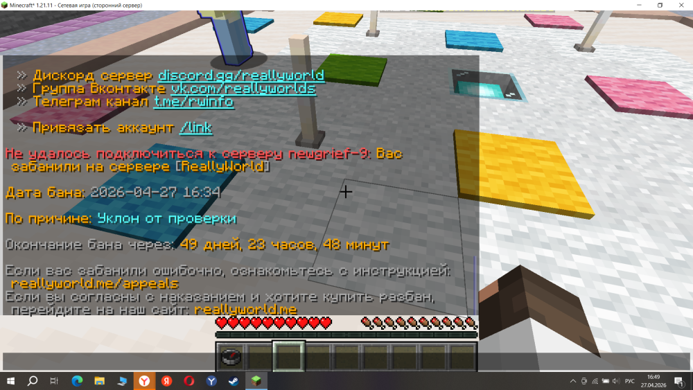 1. Ваш ник:Serega13_Toper Дата нарушения:27.04.2026 Суть нарушения:вызвали на проверку я дал доступ через деск адмнистратор не чего не сделал +дали бан ошибачно на 50 дней Номер грифа и режим гриферского выживания: №9 Доказательства о нарушении (фото/видео):я играл на сервере бегу к путеводителю во екзкритке с головой супермена сразу скаажиу что незеритк я делал благодаря слиткам незерита в кузнечном столе а голову купил потомучто перепродовал вещи и еще я не скрываю я попрошайничал уголь на работе шахтера Дополнительный комментарий: Важно: