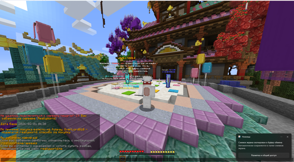 1. Ваш ник:tawny_ss Дата нарушения:02-01-2026 Суть нарушения:бан за покупку на фанпей Номер грифа и режим гриферского выживания:32 Доказательства о нарушении (фото/видео): Дополнительный комментарий:Здравствуйте,уважаймые Модераторы,Администраторы и Хелперы.меня заблокировали на вершем сервере риливорлд Да,я осознаю свою вину.Честно,не знал,что покупать игровые ресурсы нельзя на данном сервере.Заранее не ознакомился с правилами проэкта.Прошу дать мне поощерение в виде не вечной блокировки,а выдать бан на время,готов понести любые наказания с вашей стороны,лижбы не бан навсегда. Пожалуйста,прошу,я больше так не буду.Таких инцендентов со мней не будет.Честно,не знал правила