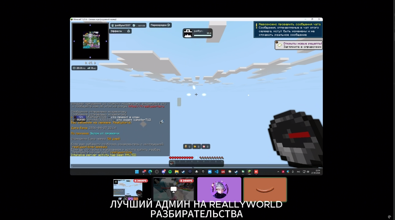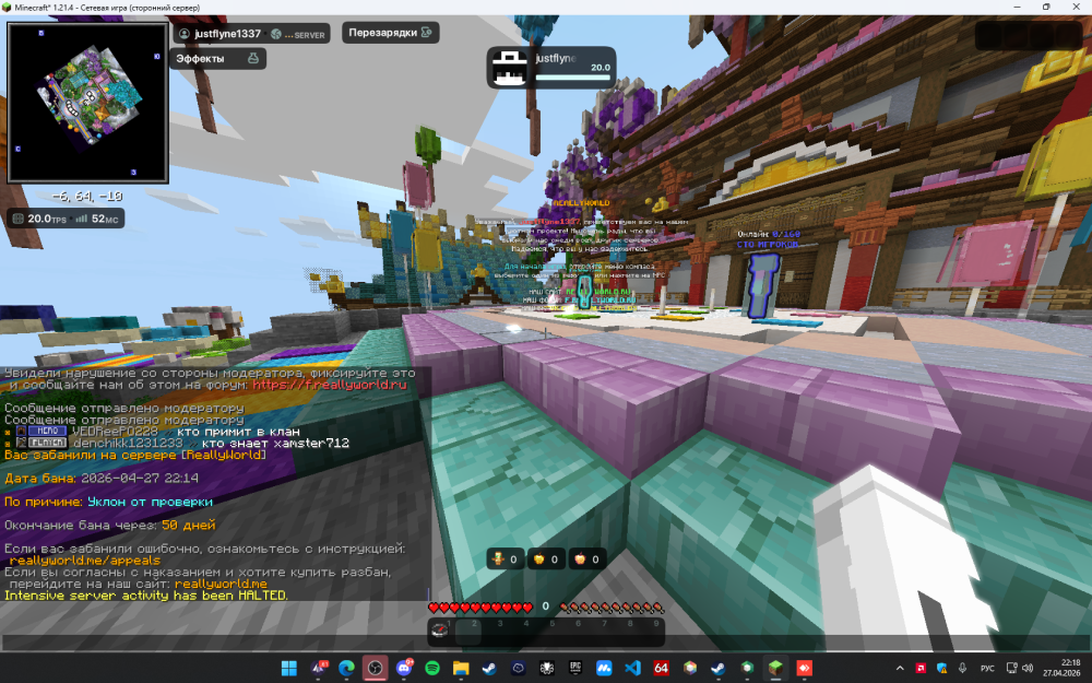 2. Ваш ник: justflyne1337 Дата нарушения: 2026-04-27 22:14 Суть нарушения: я зашел впервые на сервер, мне было нечего делать и я пошел на /warp pvp с деревянным топором, пехался пехался пока не вызвали на проверку, я модератору предоставил код от анидеска раз 10-15, и он меня все равно забанил Номер грифа и режим гриферского выживания: гриферское выживание, 24 Доказательства о нарушении (фото/видео): ниже Дополнительный комментарий: на скриншоте это если что не читы, а мод на визуалы Rival Visuals 1.21.4