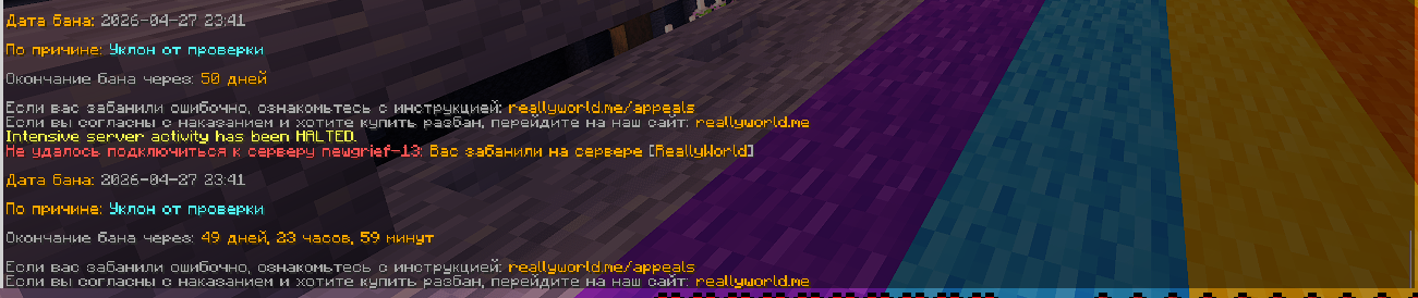 2. здравствуйте, 27.04.26 в 23:41 меня вызвали на проверку, из-за того что у меня не мощный пк, я не успел отправить код от анидеска. Я готов пройти проверку через анидеск или дискорд. в момент моего бана со мной был друг в дискорде, который может подтвердить что я был без читов и был готов пройти проверку, ник: tormoz_eba у беня был оверлорд, я просил проверяющего пройти через дискорд, но он молчал.