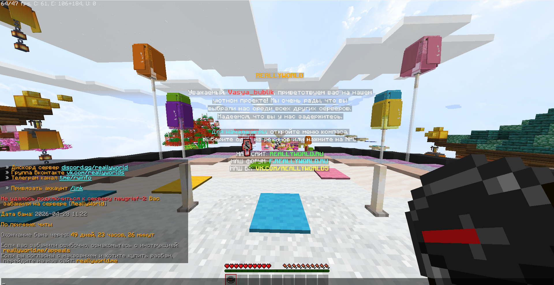 2. 1.Vasya_bublik 2.28.04.2026 3.бан без проверки по причине: читы 4.гриферское выживание, гриф 2 5.прикреплено ниже 6.пехался с другом в дуэлях и нас забанили по причине читы хочу подать жалобу за бан без проверки на модератора