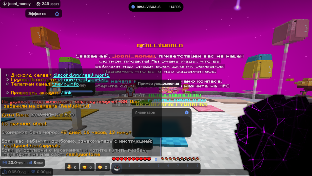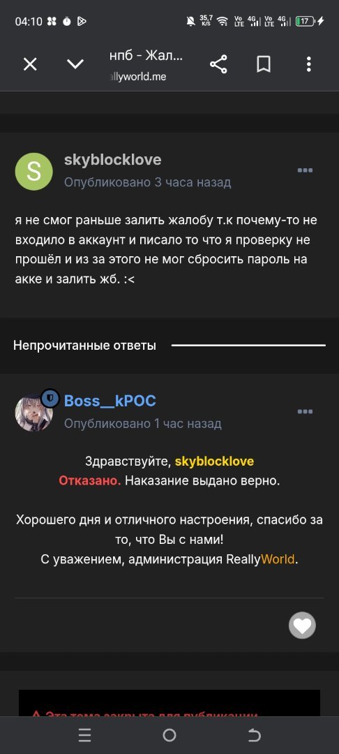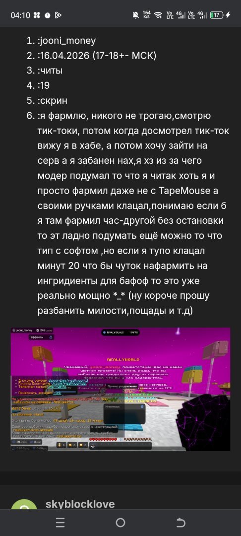 Дополнительный комментарий:я изначально хотел пофармить на своей фарме для игридиентов на зельеварения, фармил минут 20 и смотрел тт, после поднимаю бошку а там уже бан выскакивает :/, хотя я даже не видел то что меня в принципе вызывали на проверку. и я когда смотрел чат после бана тоже не видел вызова проверки, после чего я спустя много попыток и мучений войти в акк на форуме заливаю жб. Мне спустя 2 часа как залил жб пишут сразу же отказано, то есть не на рассмотрении ничего а сразу отказано :/. Я считаю что человек который проверял мою жб даже не вошёл в саму суть ситуации и с размаху ноги лепанул мне отказано. Ну типо рил я играю без софта, сидел на фарме минут 20, ну максимум 35. И меня банят сразу же по причине чит.💀💀💀
