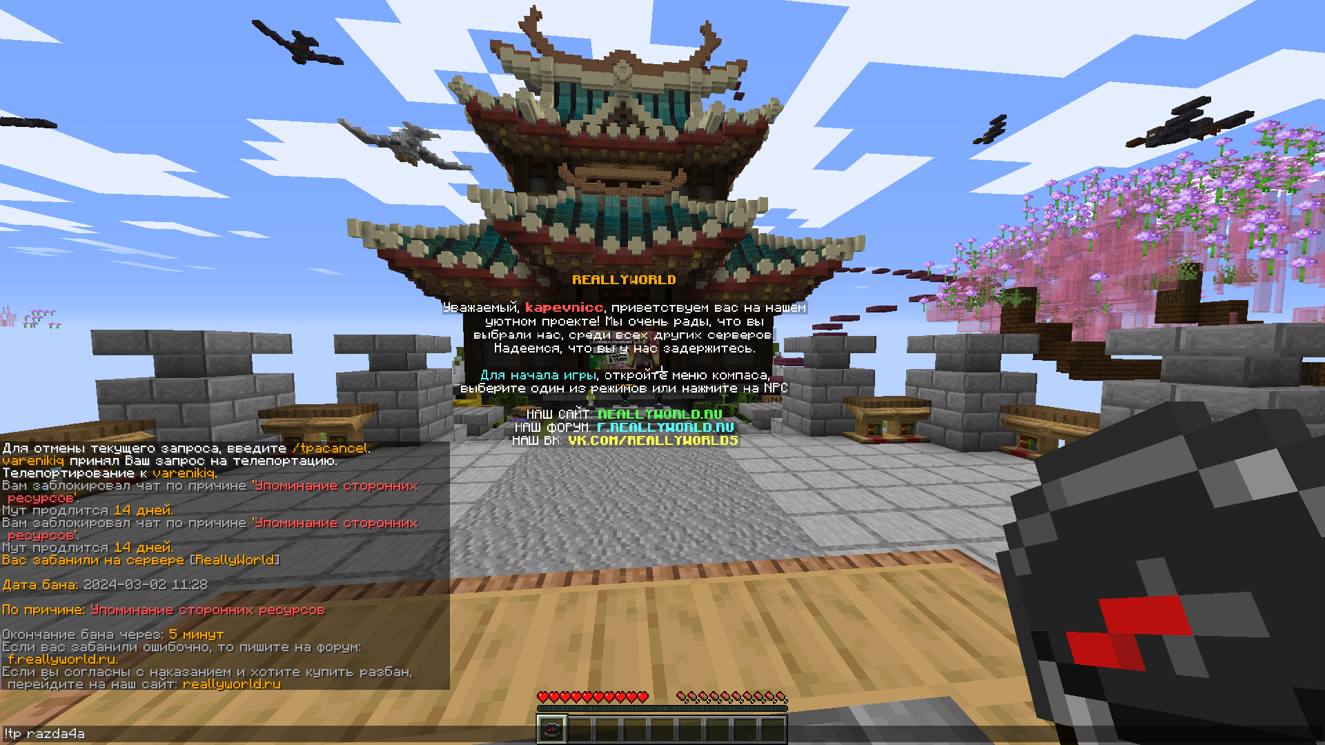 5.Дополнительный комментарий: я играл с другом тепнулся к нему захотел раздать свои ресы и написал tp razda4a и мне выдали мут на 14 дней,бан на 5 минут