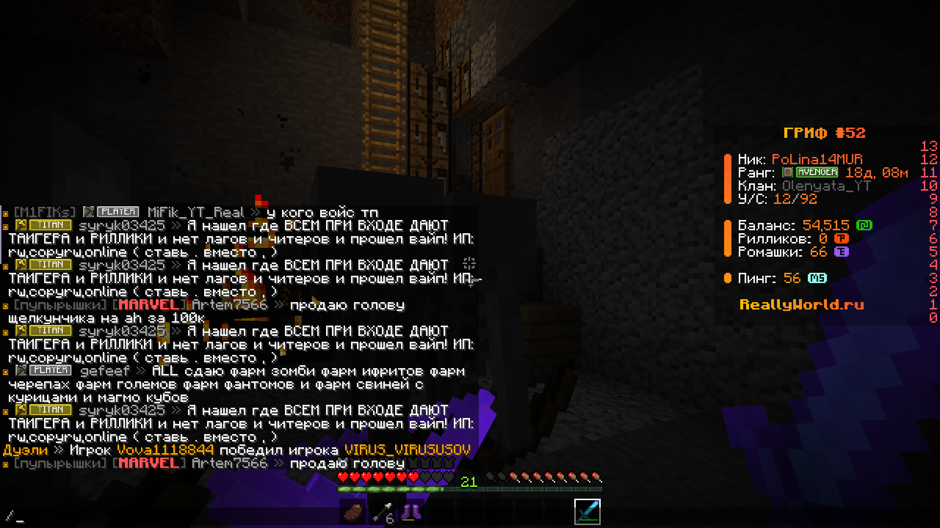 Ваш ник: PoLina14MUR Ник нарушителя: syryk03425 Дата нарушения: 28.04.2026 Суть нарушения: Игрок нарушил правила - 4.8/4.8.2 и 4.1 На каком гриферском режиме было нарушение (MEGA-GRIEF/GRIEF-1.16) : GRIEF-52 Доказательства о нарушении (фото/видео):