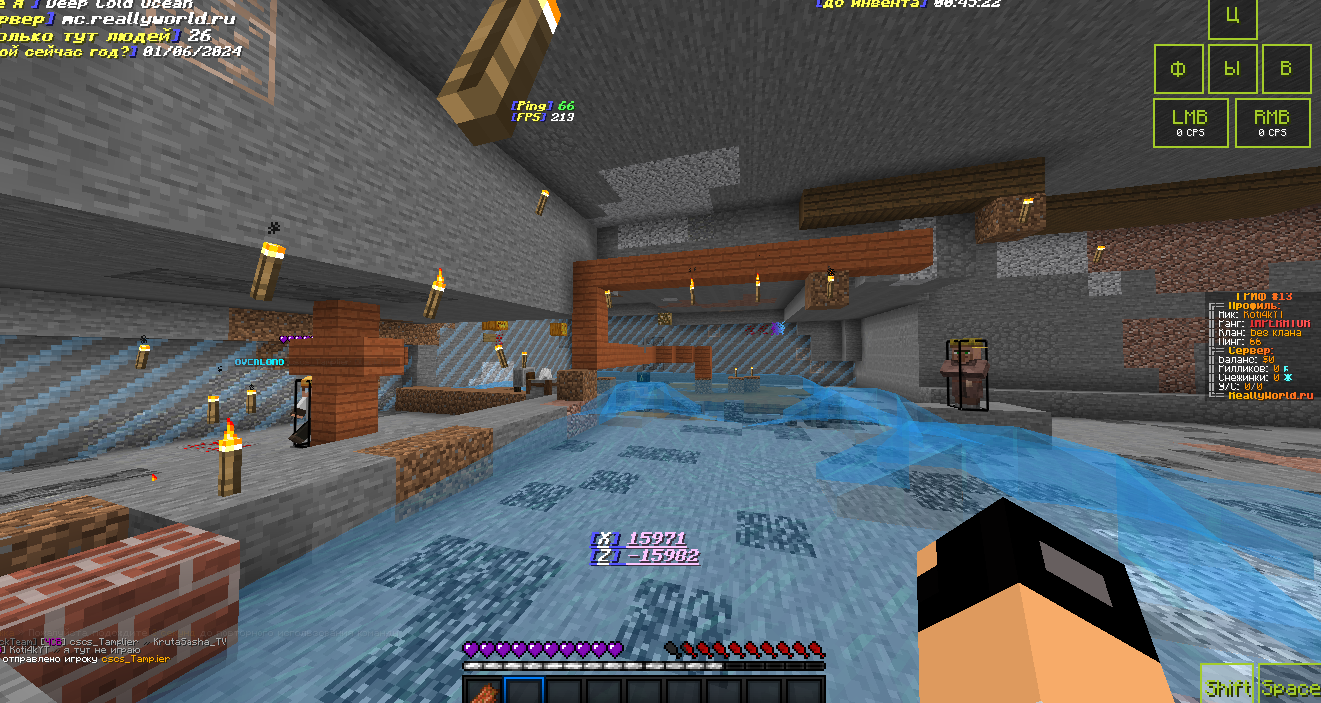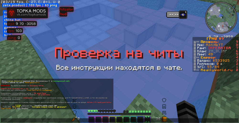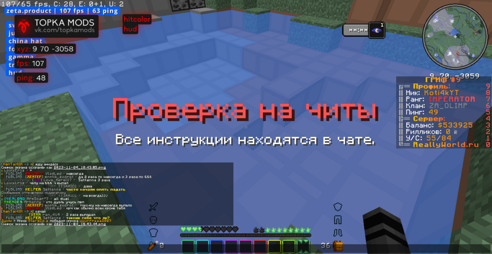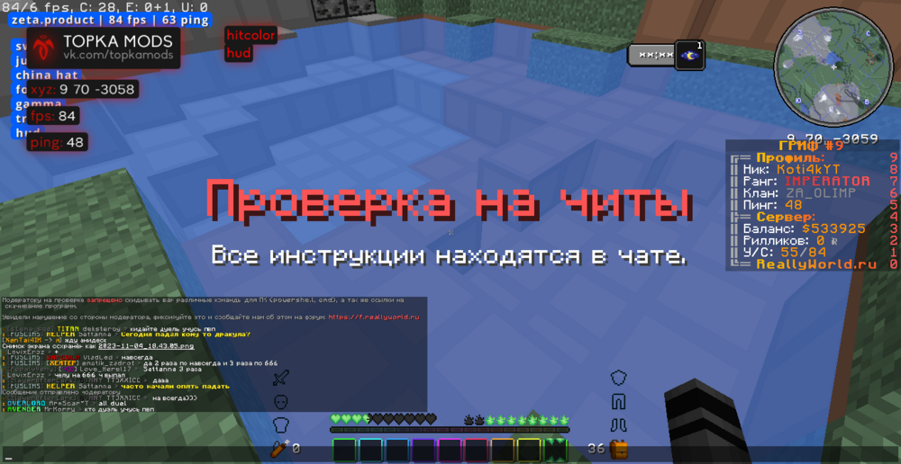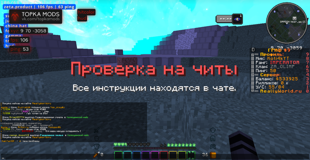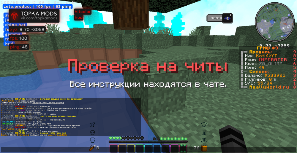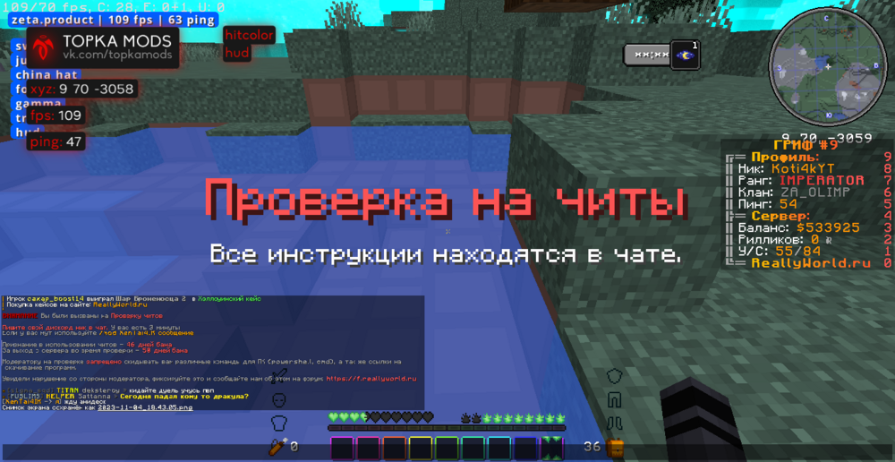 Ваш ник: Koti4kYT Ник нарушителя:RealVale Дата нарушения: 03.01.2024 Суть нарушения: читы На каком гриферском режиме было нарушение (MEGA-GRIEF/GRIEF-1.16) : 31 грифф - версия 1.16.5 Доказательства о нарушении (фото/видео): видио Дополнительный комментарий: мы играли на 31 гриффе как вдруг прыгаю в воду чтобы постоять и не затощили на арену пвп как вдруг встречаю человека из чит клана _-_ прошу забанить весь клан так как они мешают аирдропам талисманам и скружакам мадака .