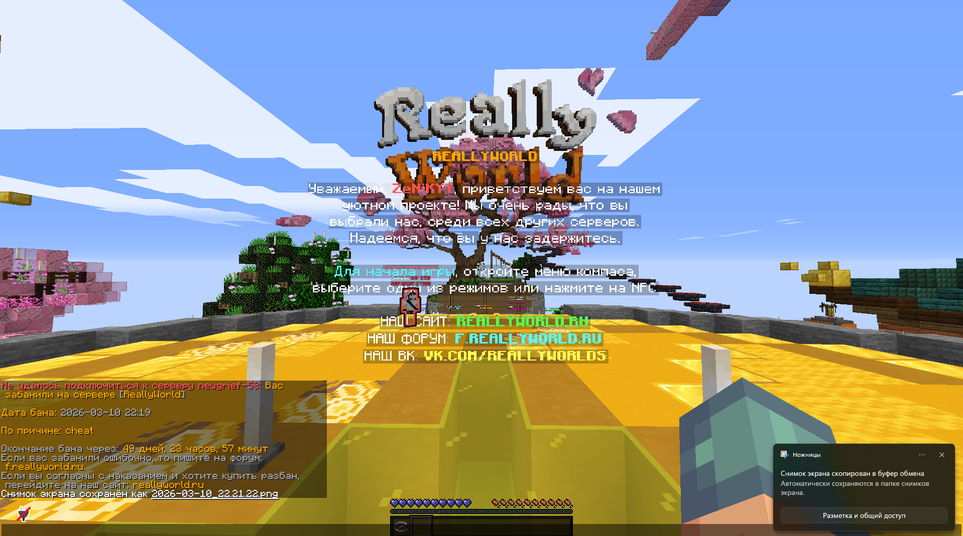 Ваш ник: ZeNiKYT Дата нарушения: 10.03.2026 ( 22.21 по мск) Суть нарушения: Некк бан строил фармилку и забанили Номер грифа и режим гриферского выживания: 58 grief Доказательства о нарушении (фото/видео): фотофото Дополнительный комментарий: строил фармилку и меня просто так забанили можете посмотреть рек у модератора ( если есть какие-то подозрения что я летал я летал с зажатым ctrl и получалось так) прошу рассмотреть