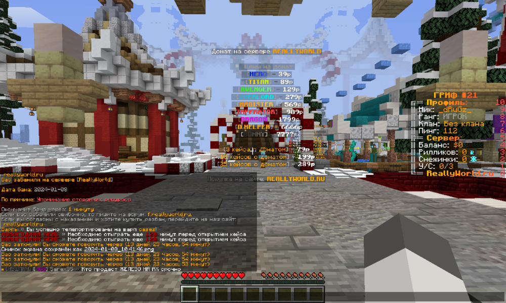1. Ваш ник: Niptun21, _dRuGz_ 2. Дата блокировки: 08.01.2024 3. На каком гриферском режиме было нарушение: (номер грифа и версия грифа) 21 GRIEF 4. Доказательства о нарушении (скрин блокировки) 5. Дополнительный комментарий (обязательно описывайте последние действия перед баном): Меня замутил бот после того как я зашел с ником Niptun_Grief (наверное изза приставки Grief).