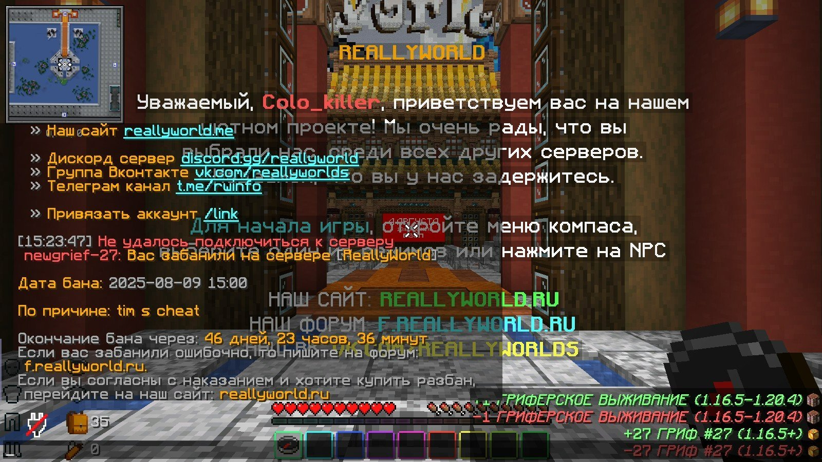Hopnik Опубликовано 9 августа, 2025 Опубликовано 9 августа, 2025 1. Ваш никнейм: Colo_killer 2. Дата Бана: 09.08.2025 3. Суть нарушения: тим с читером 4.Номер грифа и режим гриферского выживания: 27 5. Фото доказательство: 6. Дополнительный комментарий: не с какими софтами я не тимился, откинули фулл 2 клана, клан "дс_пошли" и "Dark_D3m0ns", с софтами мы не тимились, 1 игрок сказал, что он прислал скрин бана у нашего тимейта за лив с проверки(скрин более 28 дней) понтифику, так же сетнули всё, что было в наших рг и тимейту с твинка выдали мут навсегда за причине оск родителей( за это мутят на 15д макс)