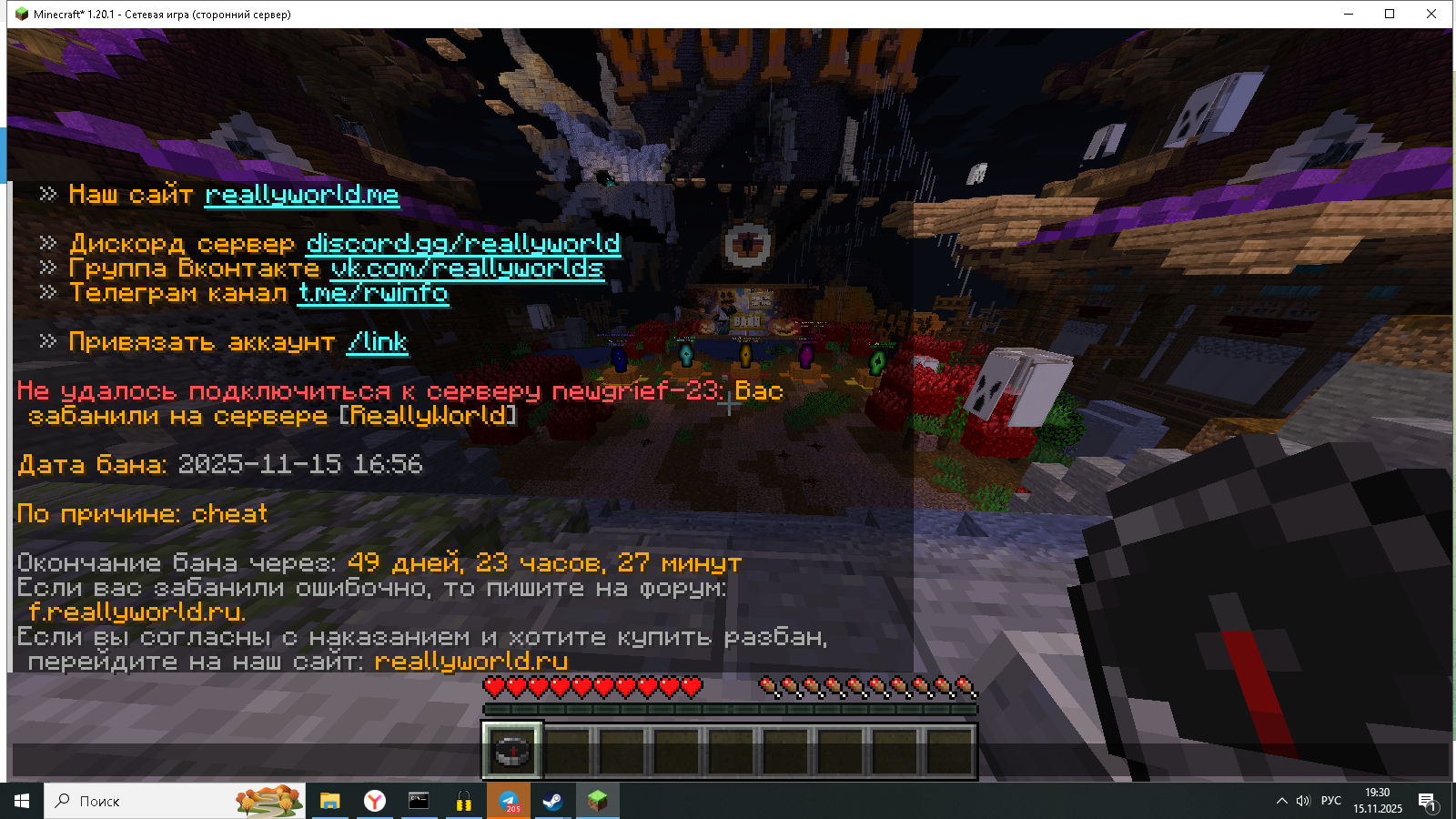 holdendura Опубликовано 15 ноября, 2025 Опубликовано 15 ноября, 2025 Ваш ник: holdendura Дата нарушения: 15.11.2025 Суть нарушения: хз, перезашел из сервера и уже бан, на проверку не вызывали Номер грифа и режим гриферского выживания: гриф выживание 23 Доказательства о нарушении (фото/видео): Дополнительный комментарий:я хотел написать тиммейту модер может брать всё что хочет из креатива,и после слово модер меня кикнуло из за инета,потом я захожу по айпи ru.reallyworld.ru чтобы не было пинга а у меня бан''