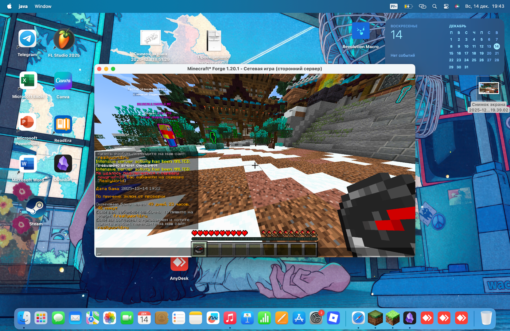 Stanislavski Опубликовано 14 декабря, 2025 Опубликовано 14 декабря, 2025 1.DoXl1y_xeR 2.2025-12-14 19:22 3.Уклон от проверки 4.Гриферское выжигание 39 гриф 5.Добрый вечер.Хочу обратиться за помощью.Я сидел строил ферму мирно и никого не трогал, как вдруг мне прилетает проверка.Проверка через AnyDesk(первый раз сталкиваюсь).Скачал эту программу и отправлял код модератору, но у него/нее не получалось зайти на мой экран и мне прилетел бан.Что может быть важным:играю я на macOS(прикреплю,пожалуй,фото)(скачан анидеск и принципе сомнений нет).Он/она не подключилась и мне прилетел бан.Я в свою очередь никаких намеков на читы не показывал,просо строил ферму(плавал в 1 блоке и разливал воду для сливной системы).Если рассмотрите мою заявку буду очень признателен, надеюсь на положительный результат.Имя модератора(Anes_Lee)