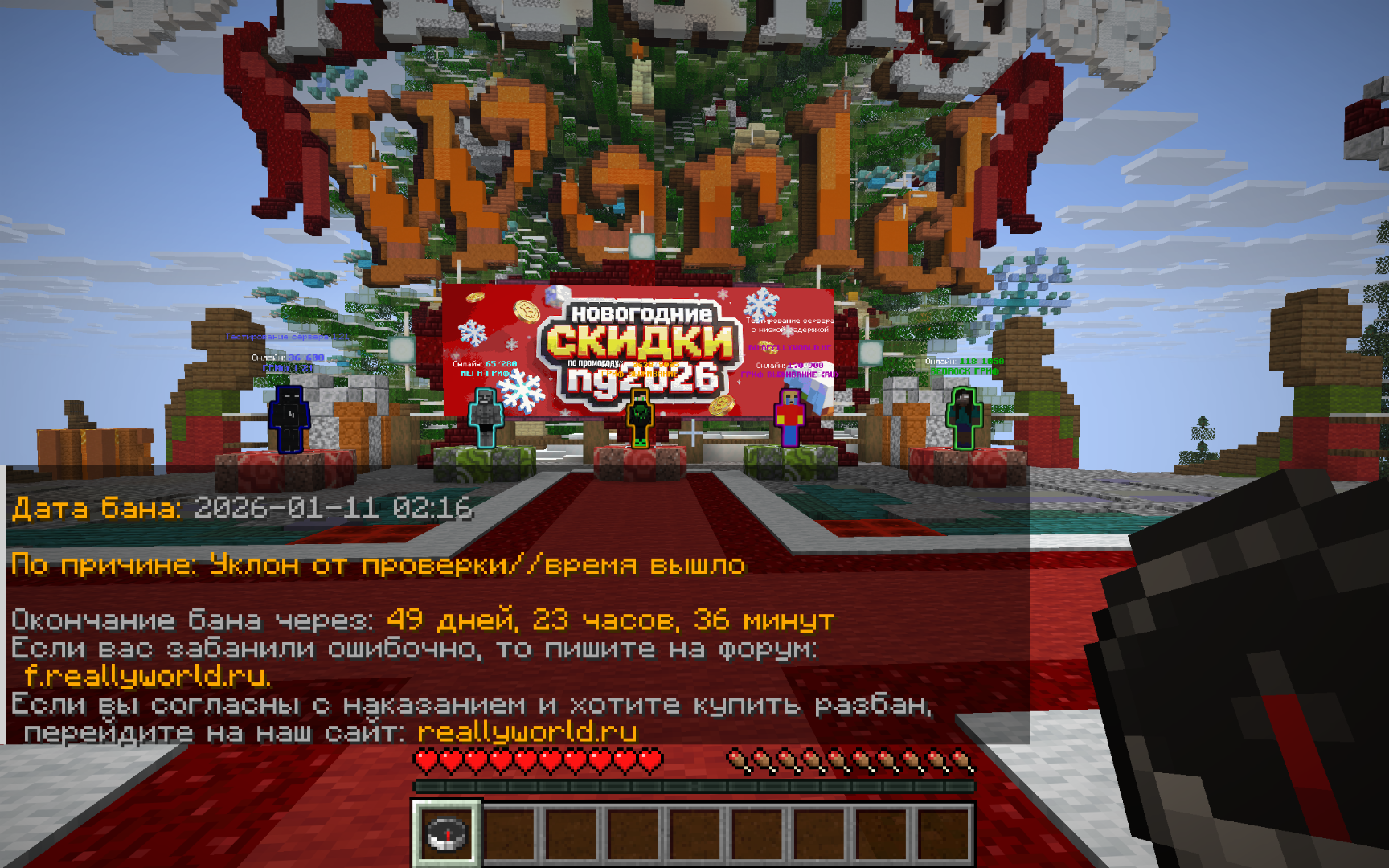danya95786 Опубликовано 10 января Опубликовано 10 января Ваш ник: XD4nch1k Дата нарушения: 2026 01 11 Суть нарушения: некк бан Номер грифа и режим гриферского выживания: 45 Доказательства о нарушении (фото/видео): ниже Дополнительный комментарий:я играл с друзьями на сервере 45 гриффа,меня и моего друга вызвали на проверку,анидеска у меня не было,хотел админимтратору это обьяснить но не смог,пробовал загрузить его,не успел зарегистрироваться дали бан,просьба:проверить мой ноут на отсутствие читов,и дать разбан.