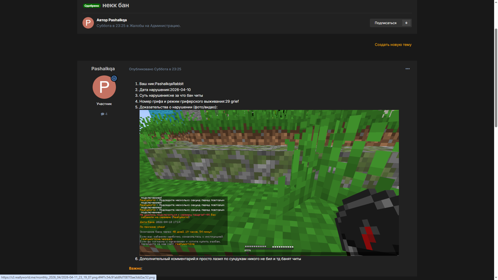 Pashalkqa Опубликовано 13 апреля Опубликовано 13 апреля Ваш ник:PashalkqaRabbit Ник нарушителя(представителя форума):freeez Суть нарушения/ошибки администратора:меня забанили за читы,модер одобрил форум,но забыл разбанить аккаунт Когда это произошло/происходит:12.04 Что должен был сделать?(Администрация форума):Разбанить аккаунт Доказательства о нарушении (фото/видео): Дополнительный комментарий, ссылка на жалобу (если есть):не знаю влияет ли скрин,для подачи форума,я не смог никак заскринить низ с никнеймом модератора